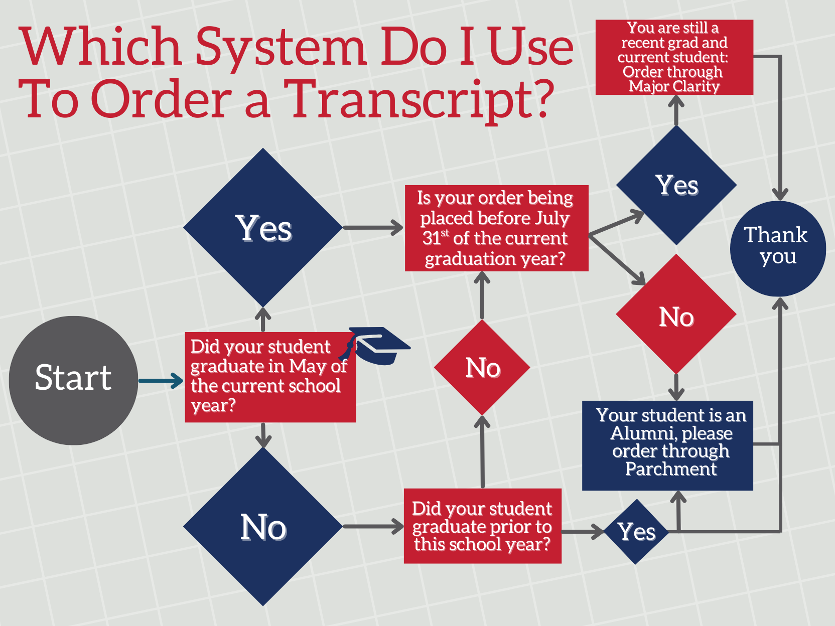For students who graduate in May, they will continue to access transcript and verification requests through Major Clarity until July 31st. After this date, they will transition to alumni status and transition requests for transcripts and graduation verification through the Parchment system.